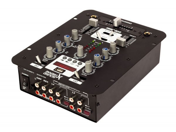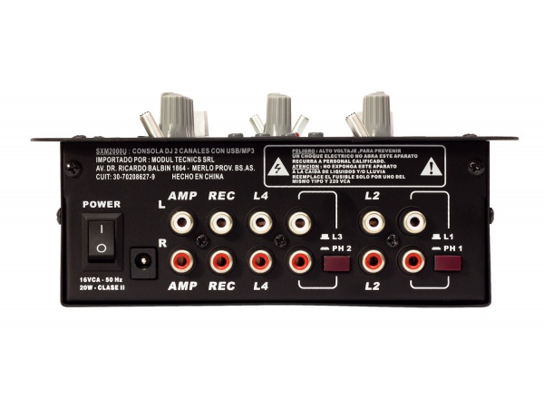 SOUND XTREME Consola 2 Canales de entrada estereo 2 fonos /1 aux. / mic Entrada USB reproductor MP3 / Display digital Bandas EQ (* 12 dB) Low: 60Hz / High: 10kHz Rta. de frecuencia (* 1 dB) 20-20kHz THD 80dB Crossfader Dimensiones (mm): 179 x 225 x 80 Alimentacion: 220 VCA 50Hz. (externa incluida)